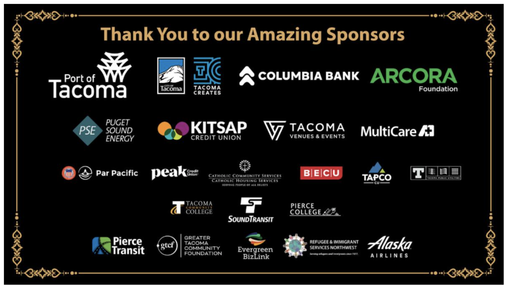 我們要感謝雙鑽石和白金贊助商的承諾和支援:塔科馬港、塔科馬創造、塔科馬市、阿科拉基金會和哥倫比亞銀行(Port of Tacoma, Tacoma Creates, City of Tacoma, Arcora Foundation, and Columbia Bank)。 在您的支援下,我們能夠繼續為整個社群提供免費入場的活動!