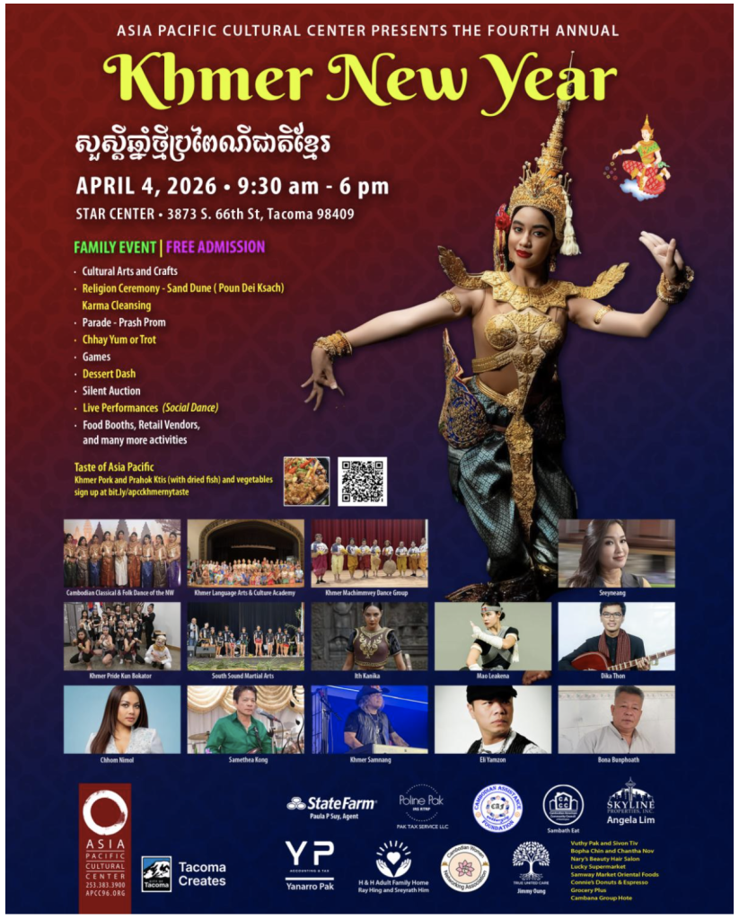 這是一個充滿活力、家庭友好的活動,旨在紀念柬埔寨的遺產、傳統和歡樂。 2026年4月4日星期六,上午9:30至下午6:00在塔科馬的STAR中心加入我們,享受一整天的文化體驗、現場娛樂和社群聯絡。 最重要的是,每個人都免費入場。