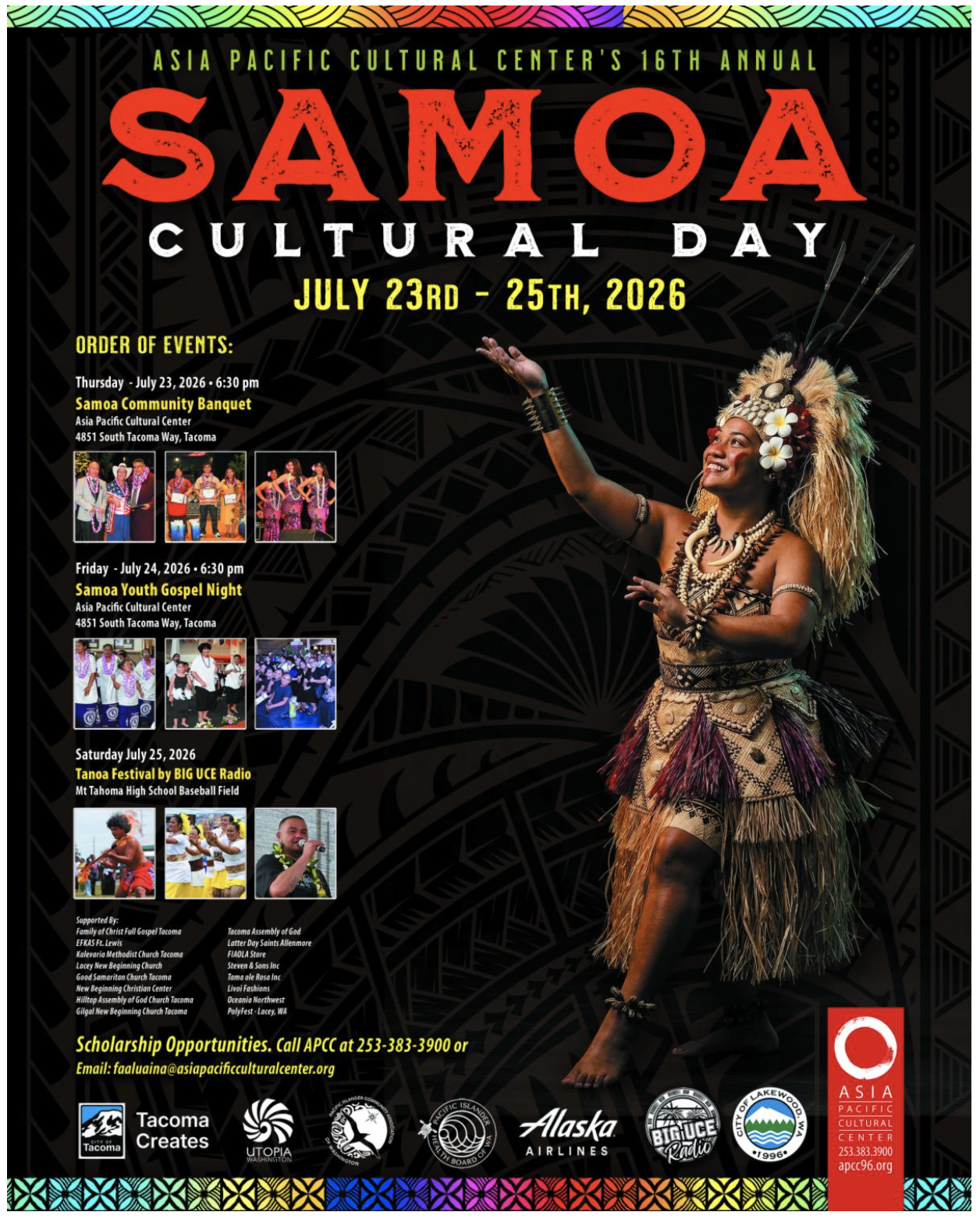 今年的慶祝活動將於7月23日(星期四)下午6:30在塔科馬的亞太文化中心拉開序幕,屆時將舉辦薩摩亞社區晚宴。賓客將享用傳統美食,欣賞精彩的文化表演,並與親朋好友歡聚一堂,為接下來充滿聯誼與慶祝的週末活動奠定基調。