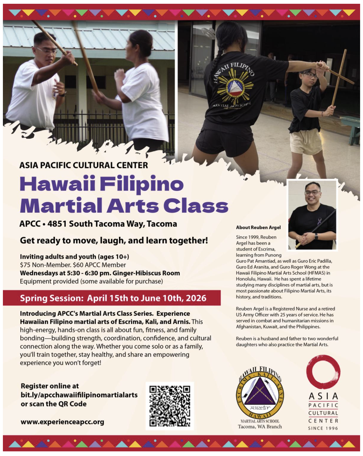 介紹APCC的武術課程系列。 體驗Escrima、Kali和Arnis的夏威夷菲律賓武術。這個充滿活力的實踐課程是關於樂趣、健身和家庭紐帶的集大成,——一路上建立力量、協調、自信和文化聯絡。 無論您是獨自來還是一家人一起來,您都會一起訓練,保持健康,並分享您永遠不會忘記的賦權體驗!