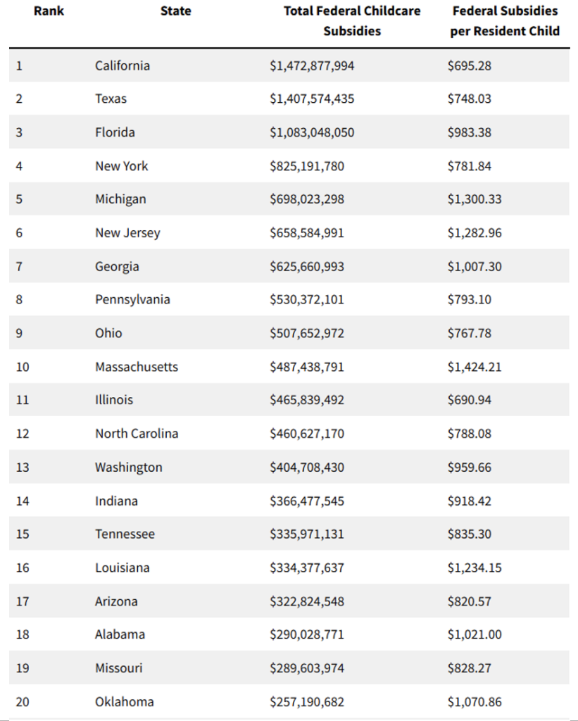 以下是獲得聯邦兒童保育資金最多的前20個州名單: